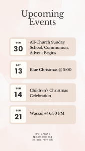 Melinda Classen will be directing the Children’s Christmas Program this year. If your child is interested, please contact her at Classenmelinda@gmail.com. Also, If you are interested in helping her with practices, costumes, props, etc, please let her know.